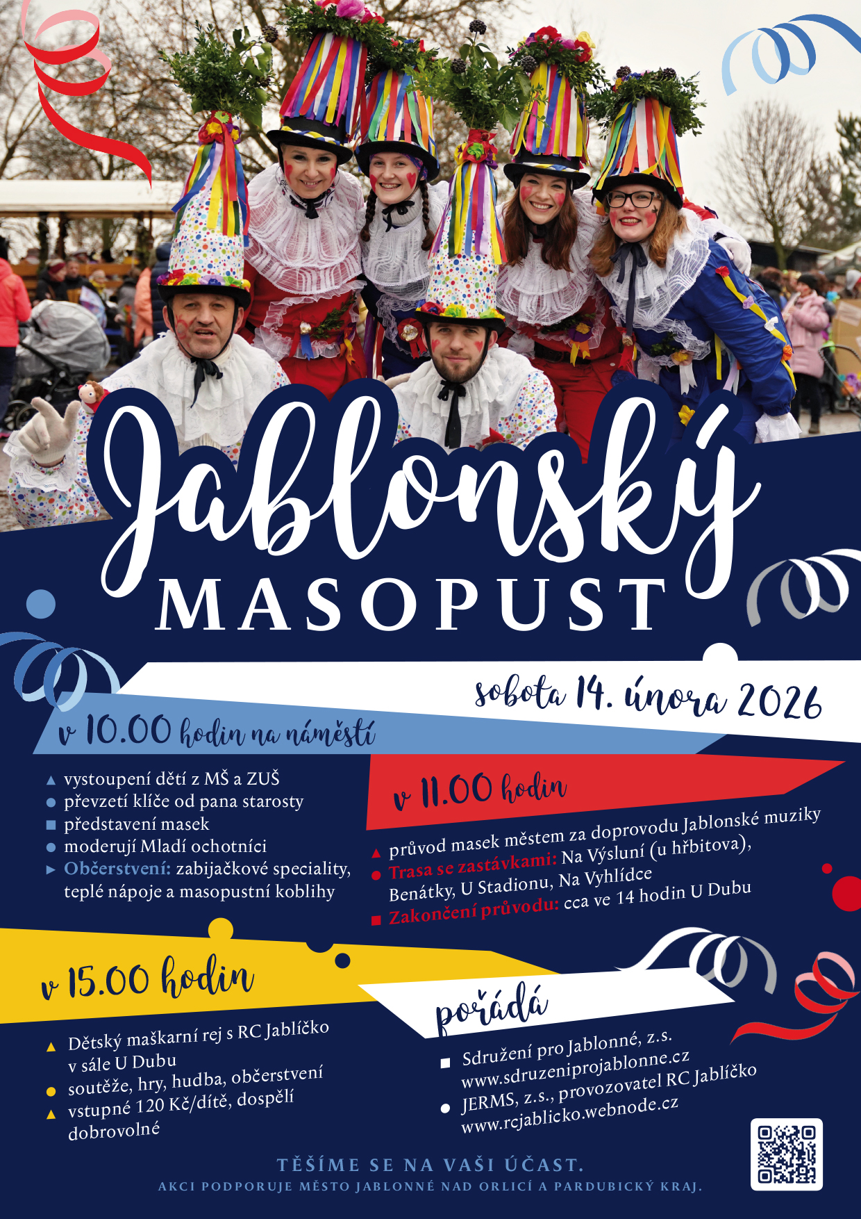 Milí Jabloňáci, rok se s rokem sešel, a v sobotu 14. února naše město zase zaplaví masopustní veselí. Však už to dobře znáte – ráno se všichni navlékneme do kostýmů a vyrazíme k Dubu, odkud po půl desáté vyrazíme průvodem v čele s Jablonskou muzikou směrem k náměstí.