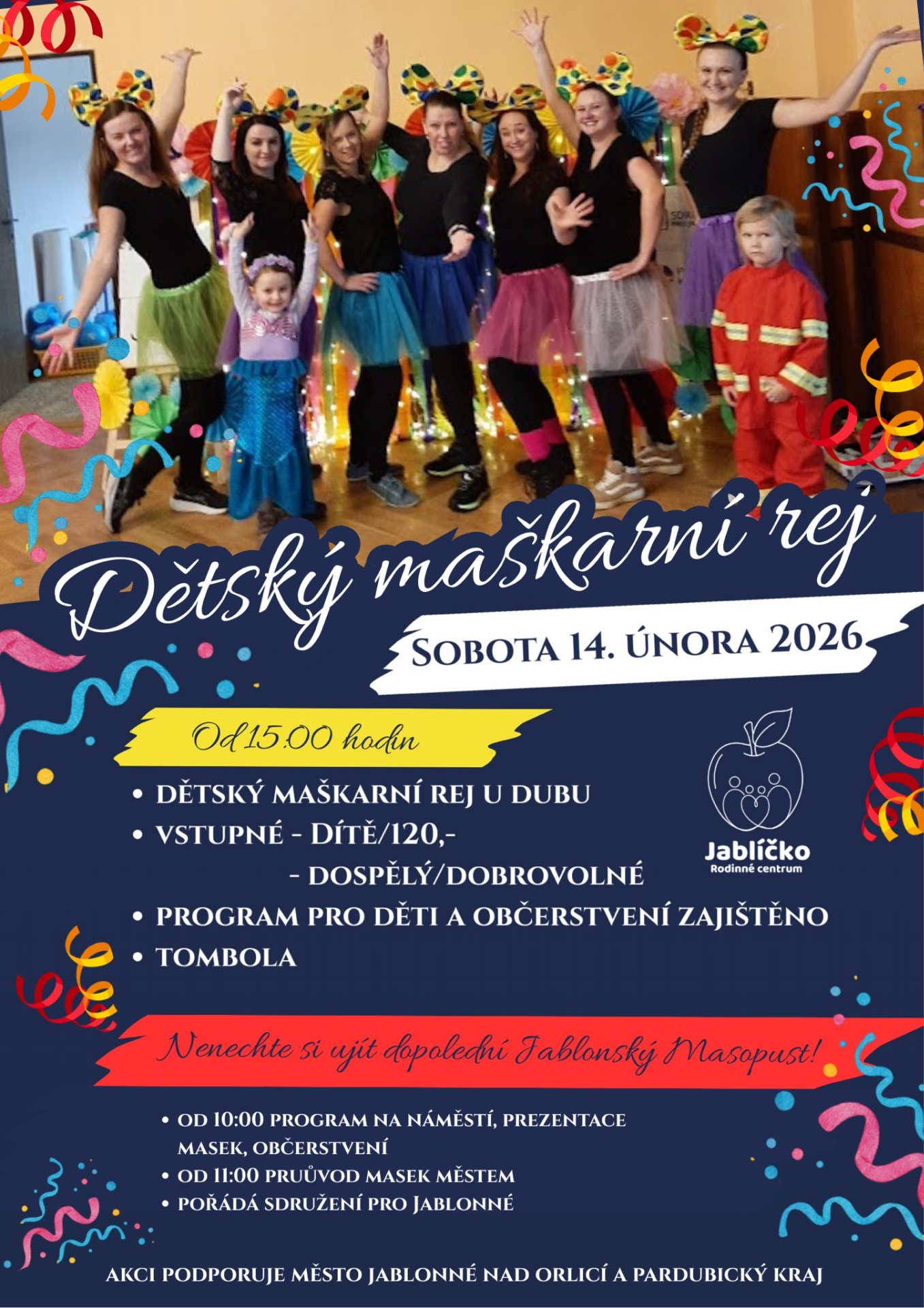 Odpoledne bude tradičně patřit Dětskému maškarnímu reji v sále U Dubu. Pokud jste byli loni tak víte, jak krásně umí mamky z Rodinného centra Jablíčko proměnit sál v prostor pro dětskou párty a jak skvěle umí odpolední program a zábavu připravit a na místě rozjet. A právě RC Jablíčko se letos ujalo celé organizace dětského programu a my moc děkujeme za spolupráci. Bude to parádní!